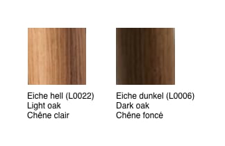 Une élégante structure à 4 pieds en bois (placage en bois composite aspect chêne), au choix en clair ou foncé, soutient le mince plateau rectangulaire en tôle d'acier pliée et laquée. Le plateau de table et la structure sont disponibles librement assemblables.