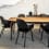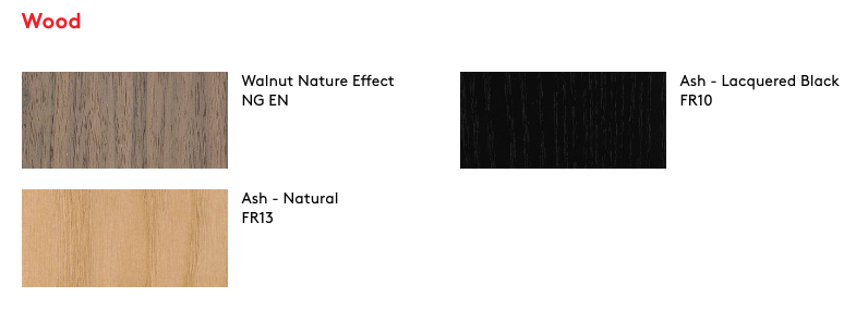 Frêne nature laqué, frêne teinté en noir ou noyer laqué nature au choix. Un autre modèle propose un plateau en verre de 10mm d'épaisseur.