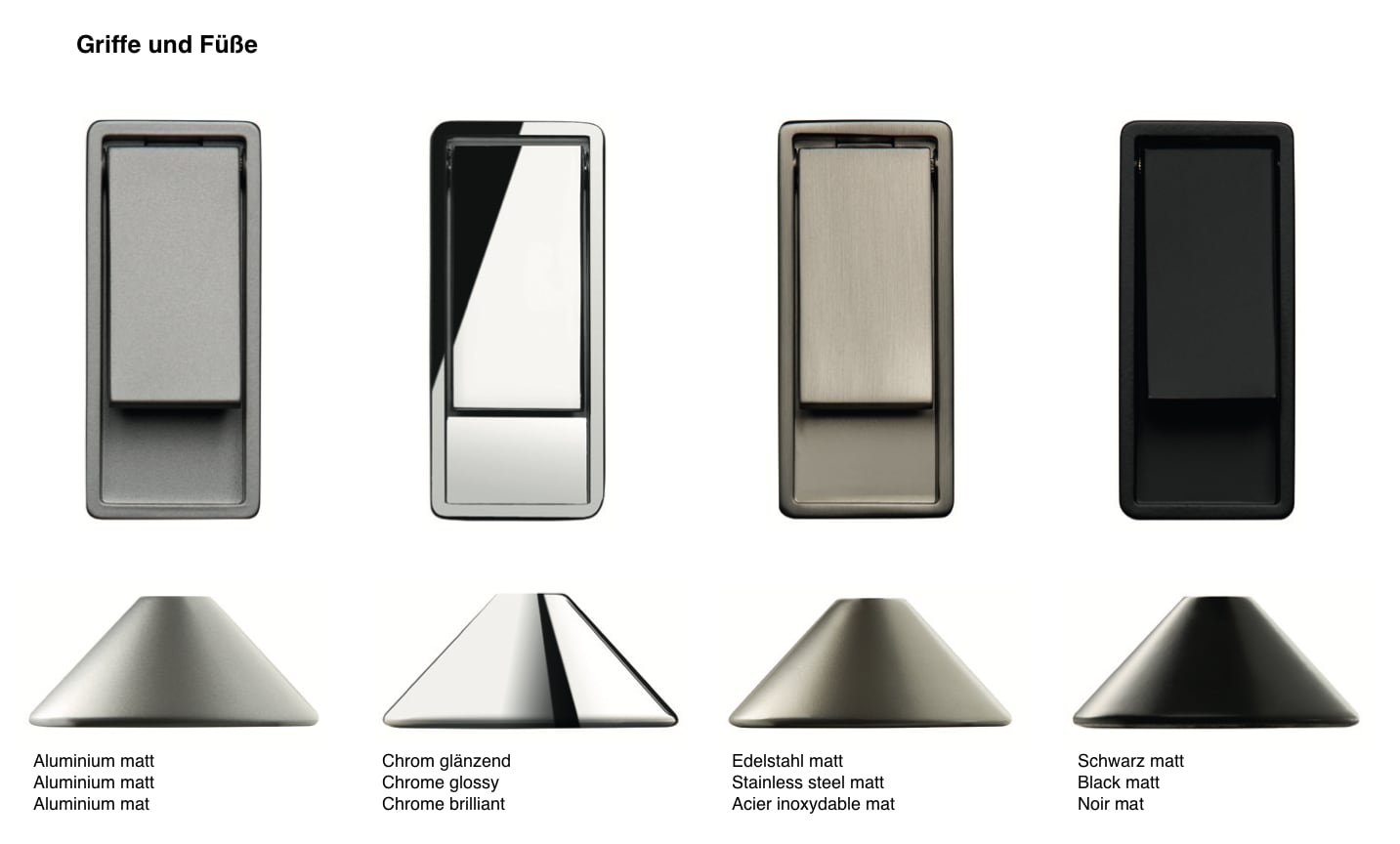Commode Menos Y 1452 avec 2 grands tiroirs, 2 portes battantes et 2 étagères. Les pieds et les poignées de la commode sont toujours livrés dans la même finition et sont disponibles au choix en alu mat, inox mat, noir mat ou chrome brillant.