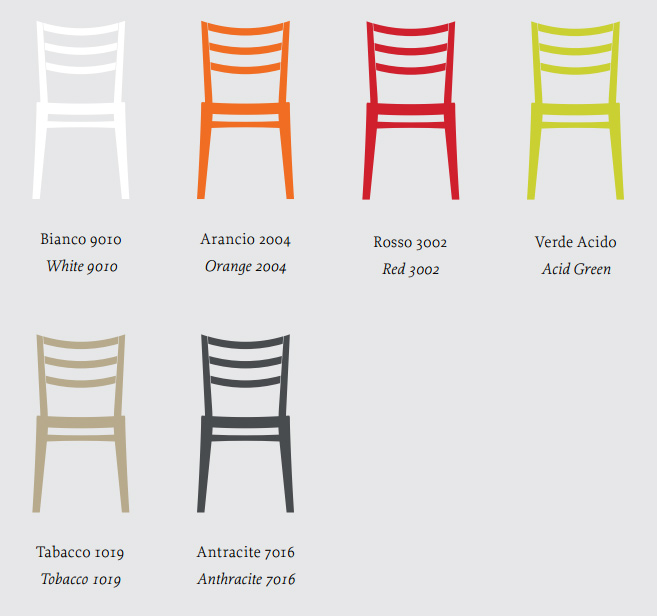 Chaise légère et empilable en matière plastique. Disponible en blanc, en anthracite ou en couleurs printanières. Pour l'intérieur et le jardin.