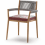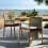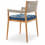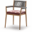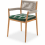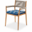 La gamme de meubles Dine Out a été pensée pour placer la zone « dining » extérieure sous le signe du confort, de la convivialité et du style sophistiqué. La chaise empilable avec accoudoirs, à associer avec la table à manger aux formes sculpturales, dispose d'une structure en teck massif ornée d'une corde en polypropylène gris tressée à la main autour des accoudoirs et sur la partie supérieure du dossier. L'assise doit son confort à un coussin en ouate recouverte de toile imperméable avec un insert en polyuréthane expansé, fixé avec deux lanières sur les lattes en teck massif laissant visible le châssis en bois, et complété par une bordure en gros-grain gris sur le bord supérieur. Une table disponible en trois tailles vient compléter la collection.
