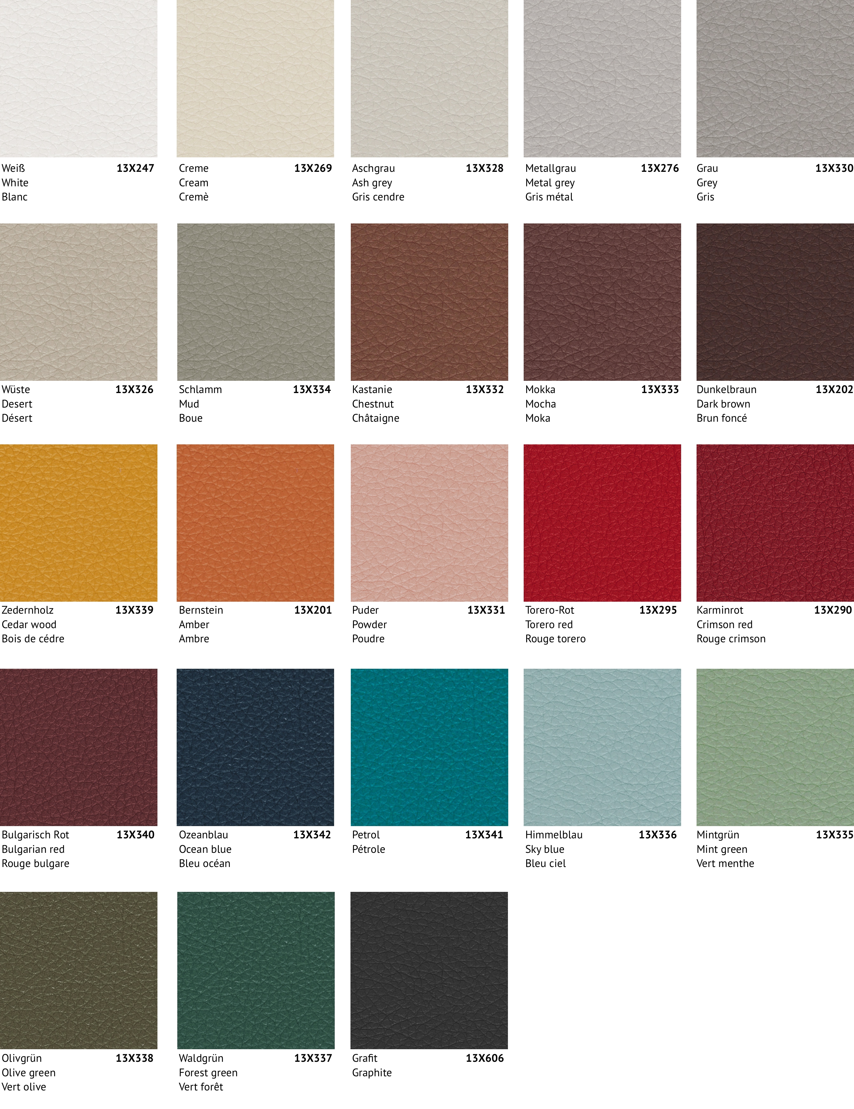 Les coussins garnis de duvet sont tout particulièrement moelleux, le rembourrage polyester quant à lui est plus lisse et plus ferme. Le cadre en acier tubulaire est chromé ou laqué couleur, les revêtements sont disponibles en différents tissus et cuirs.