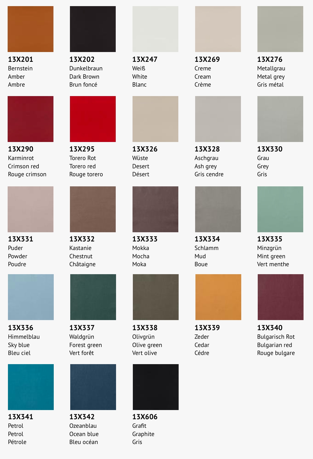 La série de canapés comprend canapés à deux ou plusieurs places, fauteuils confortables et repose-pieds (ottomans). La construction en acier est habillée de coussins généreux (mousse polyuréthane et coton polyester), le revêtement est en cuir ou en tissu. Des patins en matière synthétique équipent chaque modèle.