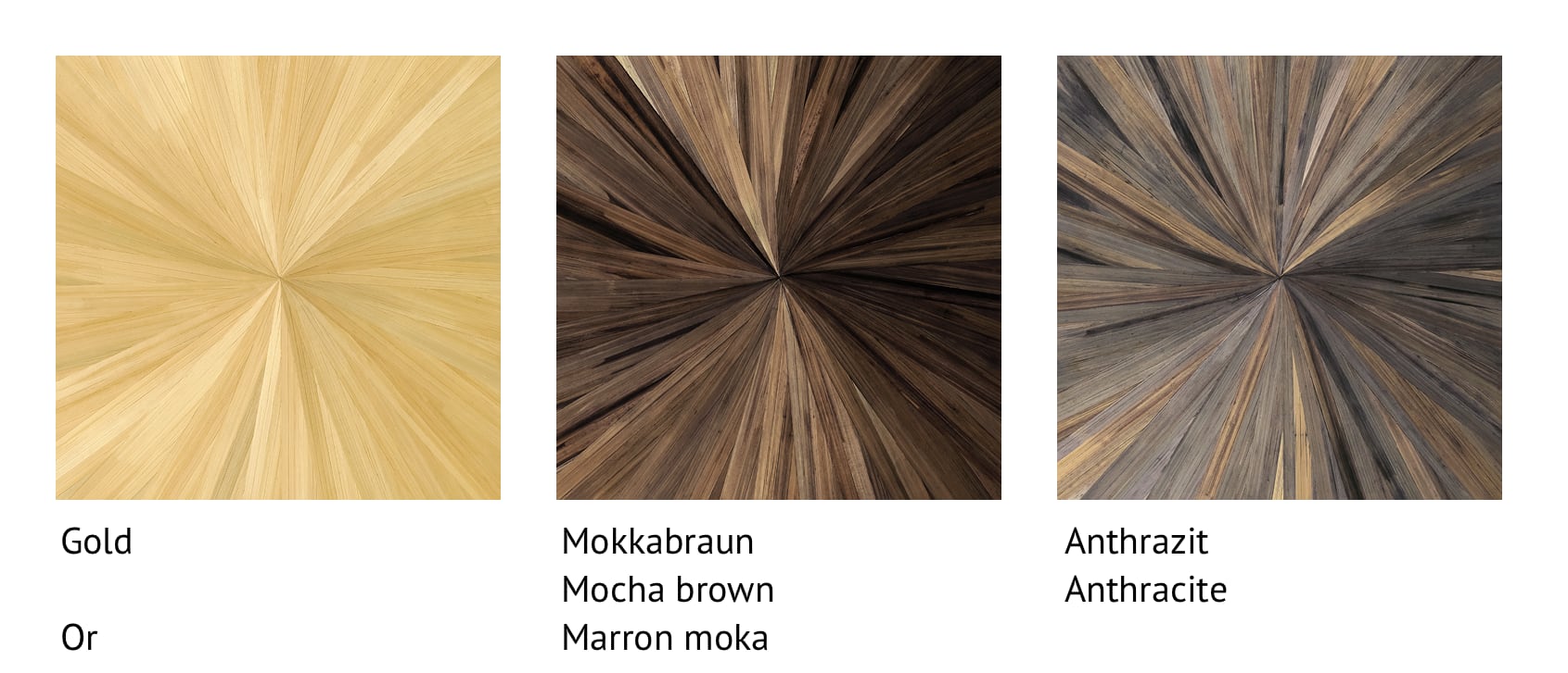 Les tables d'appoint Bell Side Table et Bell Coffee Table sont complétées par une variante dont le plateau est recouvert de paille. Les différentes nuances de la paille créent un motif tridimensionnel impressionnant, dont l'effet de profondeur est renforcé par une méthode de traitement sophistiquée. Les différentes bandes de paille sont appliquées avec précision sur une plaque de support et se répandent sur la surface comme des rayons de soleil à partir du centre.