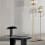 Outre les variantes en pierre de travertin à pores ouverts de couleur naturelle ou teintée à l'indigo et en bois de frêne clair, la série est disponible dans une version noire profonde avec un plateau en Nero Marquina de qualité supérieure et un piètement en bois de frêne laqué noir.