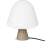 Le socle de la lampe de table Meadow est fabriqué en pierre calcaire massive, les accessoires de détail sont en laiton massif. Le petit socle est surmonté d'un abat-jour en forme de cloche en verre opale blanc mat soufflé à la bouche.