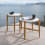 La table ronde, avec une structure en teck, propose des plateaux en béton Pearl, en grès Lava Stone ou en verre texturé gris Slate, alliant design essentiel et matériaux raffinés pour des espaces extérieurs élégants et fonctionnels.
