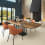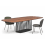 Dans la version proposée ici, la table est disponible dans différentes essences de bois à finition spéciale. Le piètement en acier et les entretoises sont laqués en noir profond RAL 9005.