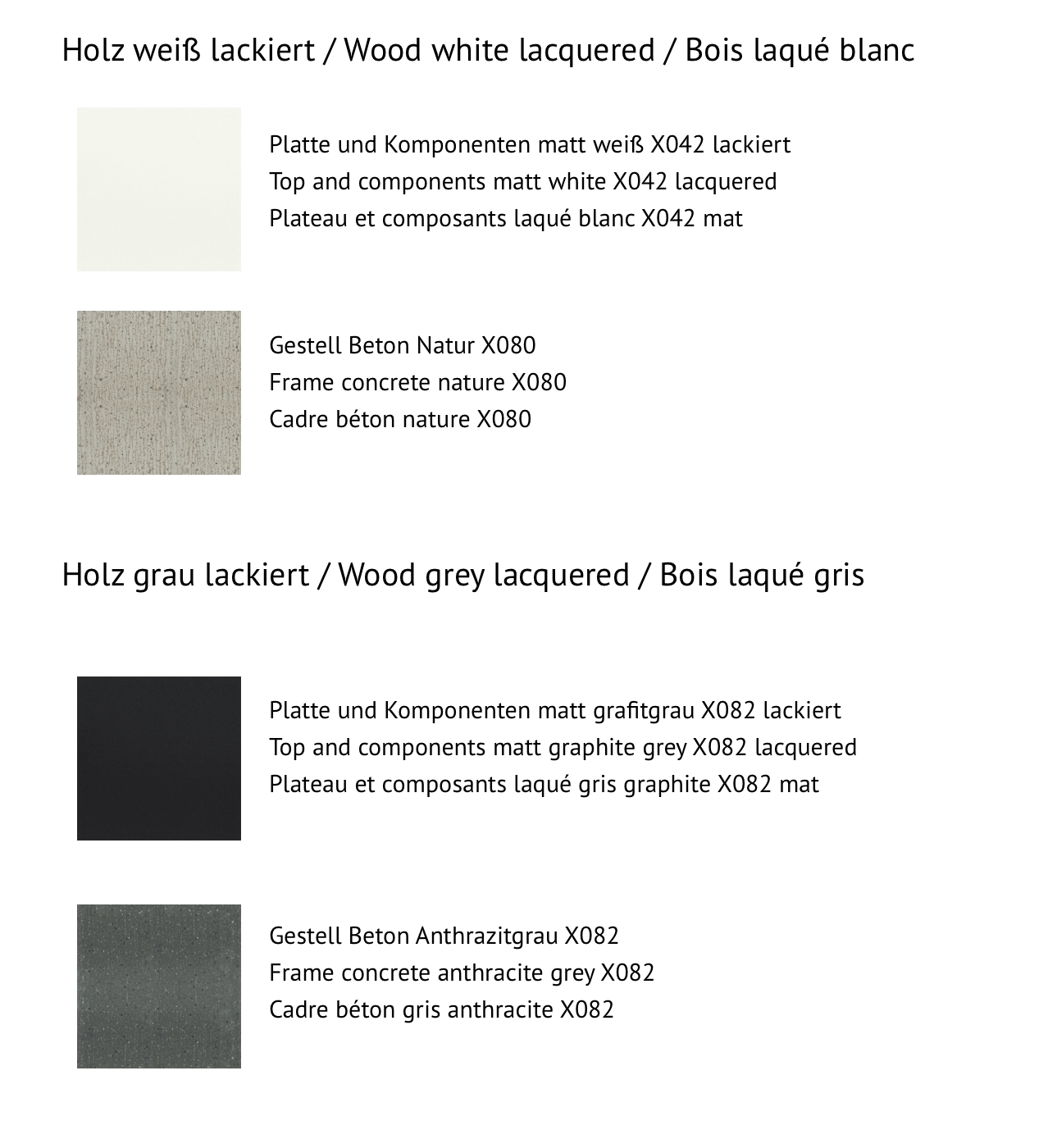 Les composants, le tube de jonction et la flasque sous le plateau, sont réalisés en aluminium et peints à la poudre dans les couleurs mat blanc, gris graphite, orange et vert.