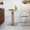 Table universelle avec réglage en hauteur par lift à gaz de 74 cm (hauteur de la table à manger) à 104 cm (hauteur de la table haute). La colonne profilée en bois massif dissimule le vérin à gaz intérieur. Plateau de base en acier inoxydable brossé.