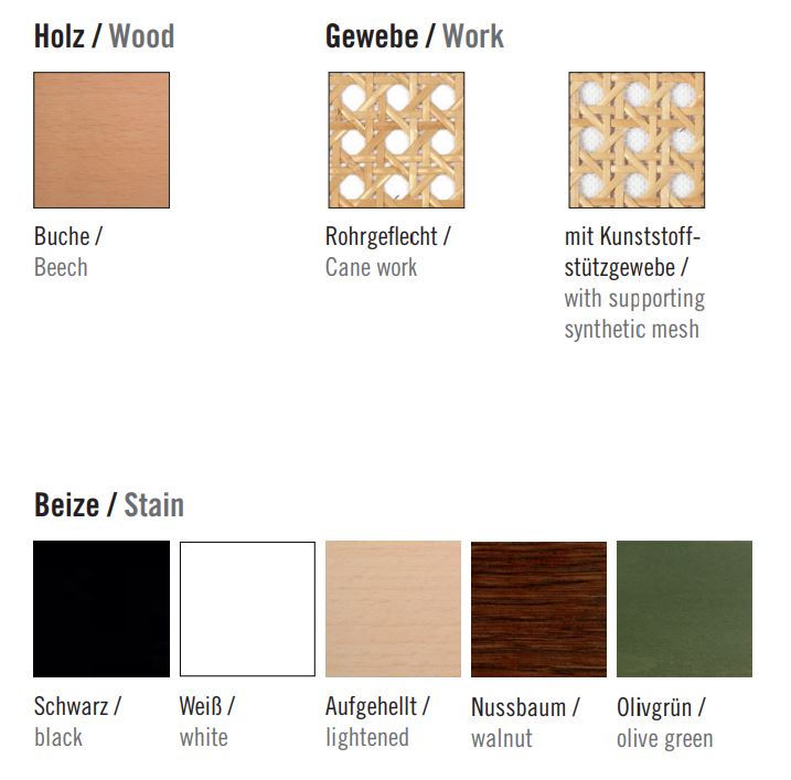 Sebastian Herkner travaille avec des détails sophistiqués pour un design moins dominant mais certainement plus distingué. Une autre caractéristique se remarque dans la forme des pieds de la chaise : arrondis à l'arrière avec une bordure claire à l'avant, ils suscitent une respiration reprise par l’assise en forme de fer à cheval. La chaise Thonet originale, la 214, est évoquée avec l’assise en une pièce et le siège viennois en osier travaillé à la main.