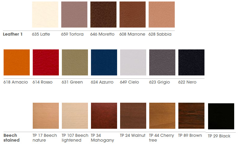 Assise et dossier avec revêtement cuir ou tissu. Les éléments en bois sont en hêtre. Existe également en version "Pure Materials".