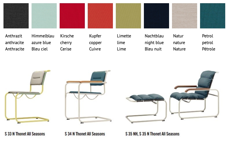 La collection Thonet All Seasons propose des coussins assortis aux sièges de manière à offrir encore plus de confort. Coussins pour le dos et l'assise des sièges cantilever S 33 et S 34, pour la collection S 35 et le repose-pieds assorti, il existe un gros capitonnage avec couture.