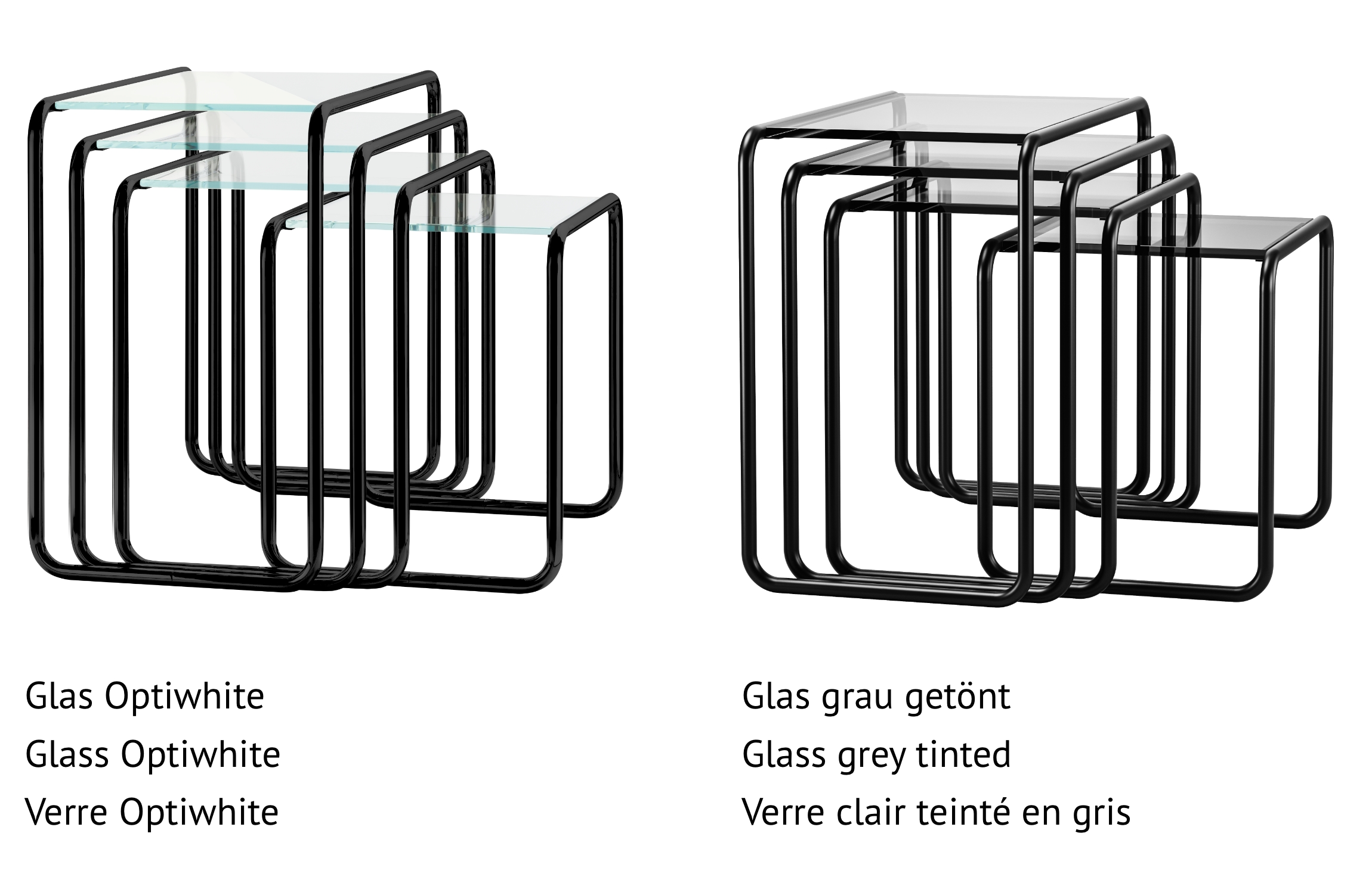La table B 9 a-d se compose de 4 éléments qui sont également disponibles séparément. Ils s'assemblent d'une façon qui permet de gagner de l'espace. Cadre en acier tubulaire laqué couleur. Ce modèle se présente avec un plateau en verre Optiwhite (entièrement transparent) ou en verre teinté gris.
