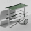 Le chariot de bar S 179 est un meuble mobile et polyvalent en acier tubulaire chromé, dont la forme est littéralement dictée par sa fonction, qu’il soit utilisé dans les salons et salles à manger privés ou comme objet de service dans l’hôtellerie haut de gamme. Un tube en acier courbé sert de support central sur toute sa longueur à la structure filigrane. Le chariot repose sur trois points : les deux roues et la partie avant courbée de la structure. Les roues sont constituées de deux disques en aluminium entourés d’un anneau en caoutchouc qui sont reliés à la structure grâce à un tube axial.
