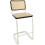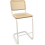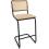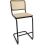 Tabouret de bar avec une structure en tube d'acier chromé ou laqué couleur. Parties bois en hêtre teinté, assise treillis tubulaire et tissu plastique transparent et robuste ou capitonnage cuir ou tissu.